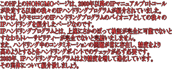 | リバーエレベーターへ農家から持ち込み、受け入れ検査で穀粒や物性、スターリンクの試験用サンプリングをおこなう。4カ所ランダムサンプリング | 契約時に交付する識別(色別)タグによってIPハンドリングのプログラムがトレースされる。当社は白色 | 受け入れ検査室、IPタグで管理される。検査は穀粒や物性、スターリンクテストが搬出開始までの間に行われる。 | |