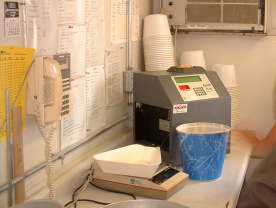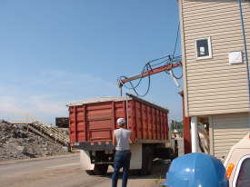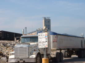 | IPハンドリング専用のバージ積載用コンベアー。IPプログラムにはうってつけの規模で1バージ/4時間の能力。 | IPタグの識別ごとに検査項目や投入ハッチやビンが管理されている。色による識別は各工程でのポカヨケにも一躍買っている。 | トラックの搬出ハッチと格納ビン。それぞれのビンはIPタグの指示に従って専用のビンに格納される。 | |