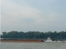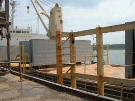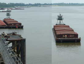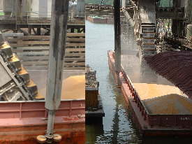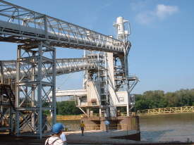 バージ積載用のコンベアー。ここでFGISのインスペクションがありプロコトール通りサンプリングと検査が行われる。 | バージを押してイリノイ川を下る。 | |