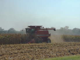 | 刈り入れ中のハーベスター。マチュアーが契約栽培種は長いが短い種は刈り取りがはじまる。 | 刈り取り風景 | 契約農家のIPビン。刈り取り後はここで保管 | |