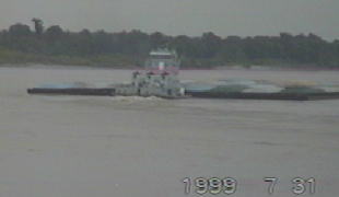 ミシシッピ川を今、下ってまーす。 バージって言う乗り物に一隻1500t積んで 何隻も押してニューオーリンズに…。 |