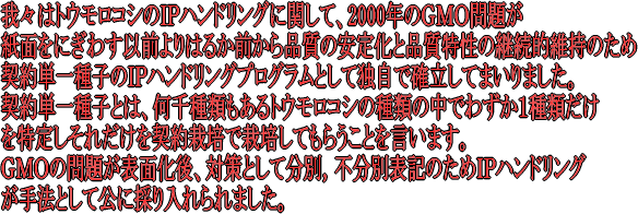 | ヒヨバク契約栽培の畑。IPハンドリングの基本は より源流でコンタミの可能性を排除すること。 |