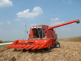 | 刈り入れ中のハーベスター。マチュアーが契約栽培種は長いが短い種は刈り取りがはじまる。 | 刈り取り風景 | 契約農家のIPビン。刈り取り後はここで保管 | |