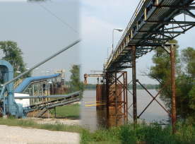 バージ積載用のコンベアー。ここでFGISのインスペクションがありプロコトール通りサンプリングと検査が行われる。 | バージを押してイリノイ川を下る。 | |