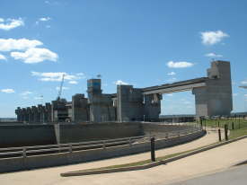| 27カ所のロックアンドダムを通り3週間の川下り、一路ニューオーリンズへ。写真は26番目のロックアンドダム | ニューオーリンズで本船の到着を待ち、シッピングビンに投入順番を待つ。 | バージの蓋を外し、中に積まれたコーンを計量器に送るローダー。1つのバケットのひとすくいは2t。ここから計量器〜シッピングビンに輸送される。 | |