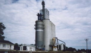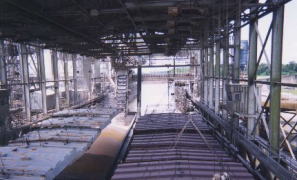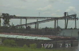 やっと、川下りの旅も終わりだー。 日本へ向かうための本船へ積む準備。 ここでバージの屋根をとって巨大な バケットエレベーターで積み込みだー。 |